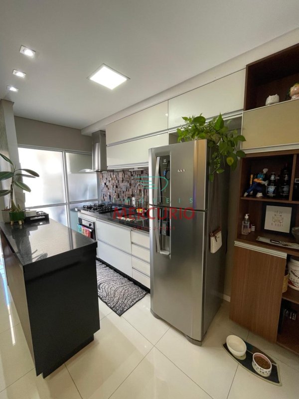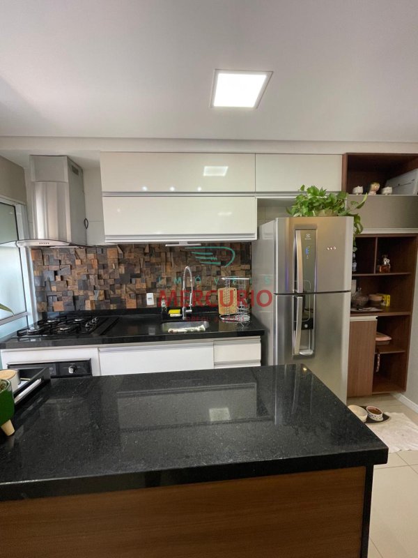 Banheiro social, Sala integrada com a cozinha com armário embutido, detalhamento em pedra de ferro, Cooktop , Forno e Coifa;
