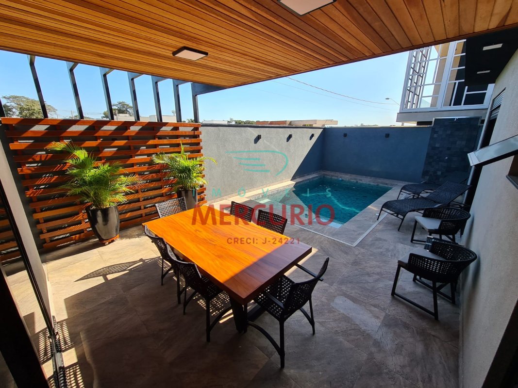 A casa oferece todo o conforto de uma casa de alto padrão, pois conta com escritório, piscina, energia fotovoltaica e espaço gourmet.