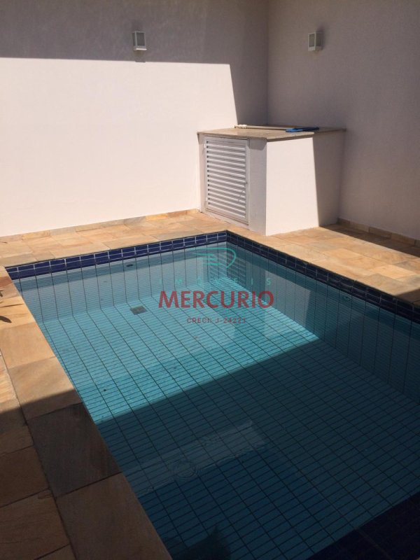 Aquecedor solar. A piscina é azulejada de alvenaria com aquecimento da água e bicos de hidromassagem.