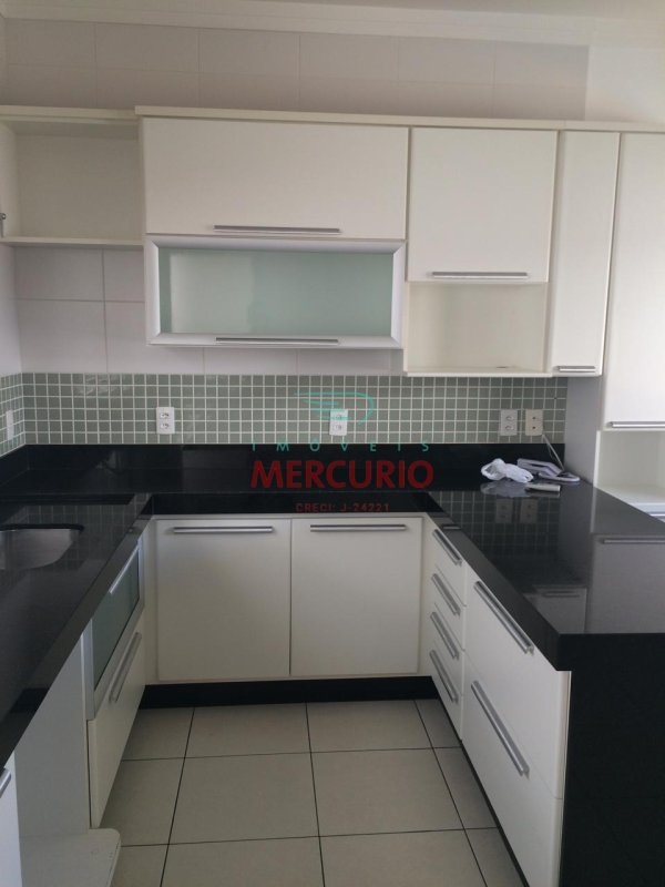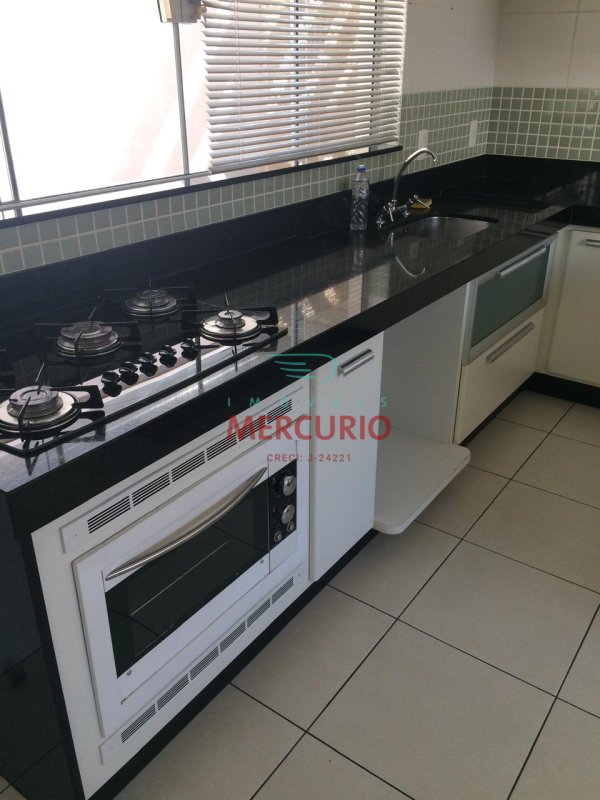 Sala com pé direito alto, cozinha planejada, repleta em armários com cooktop, forno elétrico e lava-louças.
